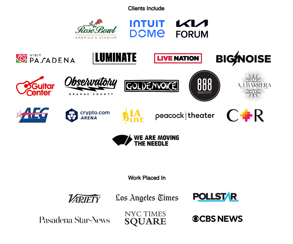 With over fifteen years of experience in the live entertainment industry, I've become the House Photographer at the Rose Bowl Stadium, Intuit Dome, Kia Forum, Crypto.com Arena (formally known as Staples Center) and Peacock Theater (formerly Microsoft/Nokia Theater). With frontline experience photographing world renowned events such as the GRAMMYs, to photographing A-list talent such as Coldplay, Billie Eilish, Taylor Swift, Karol G, and iconic sports moments with the Los Angeles Lakers, LA Kings, FIFA Club World Cup and the Rose Bowl Game and more.